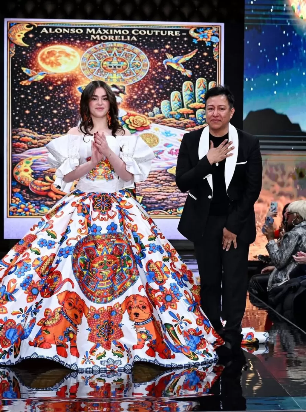 Un momento culminante del desfile fue la participación de Emily Cinnamon Álvarez, hija del campeón de boxeo Saúl “Canelo” Álvarez, quien cerró la pasarela de Alonso Máximo. Emily desfiló el vestido más icónico de la colección, consolidándose como una figura emergente entre los talentos latinos en la moda internacional y proyectando su imagen a una audiencia global. El diseño que lució Emily es notable por su color blanco con un estampado maximalista que incorpora tonos como naranja, amarillo y azul. Además de los símbolos ya mencionados, el vestido presentaba varios perritos schnauzer en honor a Morelia, la mascota fallecida del diseñador. Este atuendo, más que una prenda, fue un “homenaje vivo, una expresión de amor incondicional transformado en alta costura”, según palabras del propio diseñador.