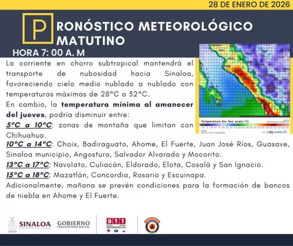 Este miércoles 28 de enero de 2026, Sinaloa se posiciona como la antesala de un periodo de contrastes climáticos. Un sistema anticiclónico contribuirá a la estabilidad del cielo y a las elevadas temperaturas del mediodía, mientras que la influencia de una masa de aire frío seguirá marcando las noches y madrugadas más frescas. La probabilidad de lluvias para Sinaloa se mantiene baja, predominando condiciones secas y cielos parcialmente nublados. El viento en la región será de dirección variable, con velocidades de 10 a 20 km/h y rachas de hasta 30 km/h.