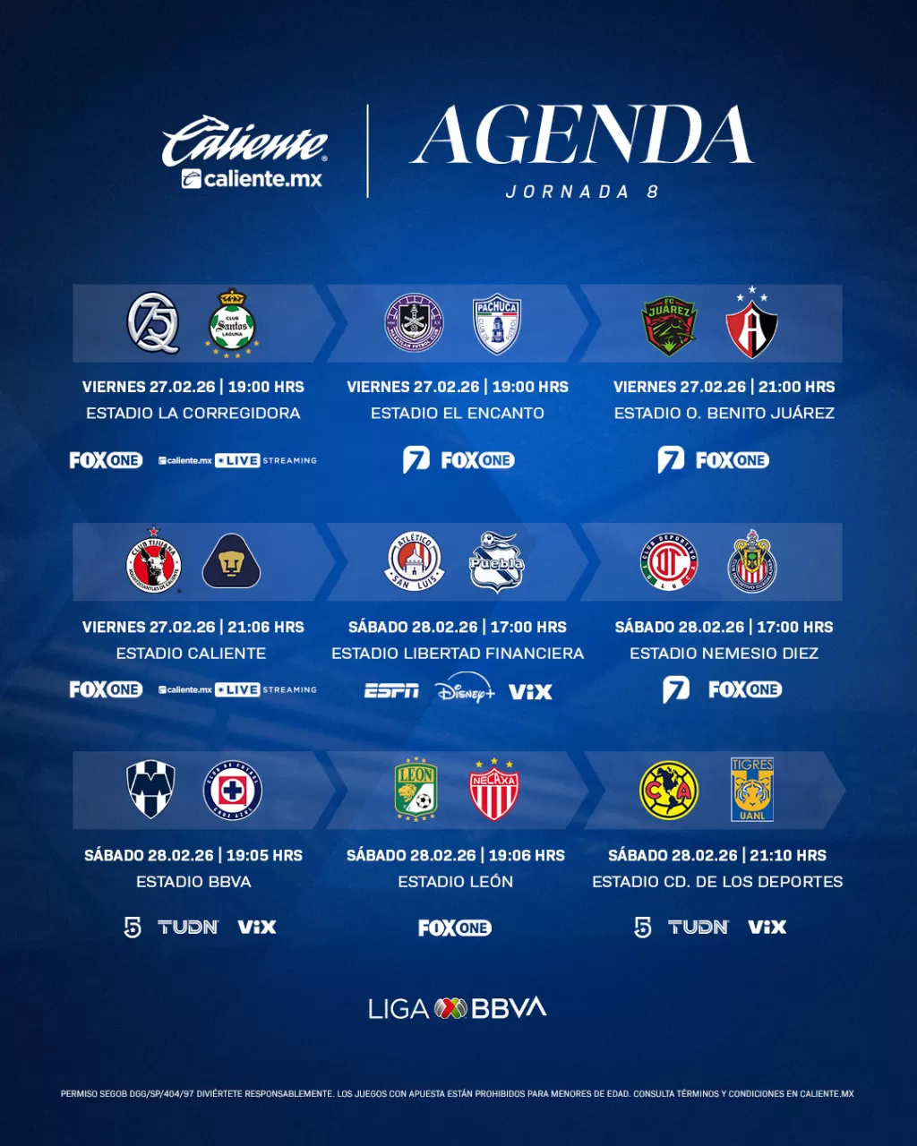 Publicado elDescubre los partidos, horarios y canales de transmisión de la Jornada 8 de la Liga MX Clausura 2026 este 27 de febrero. Querétaro vs Santos, Mazatlán vs Pachuca, Juárez vs Atlas y Tijuana vs Pumas. ¡No te pierdas ningún detalle!