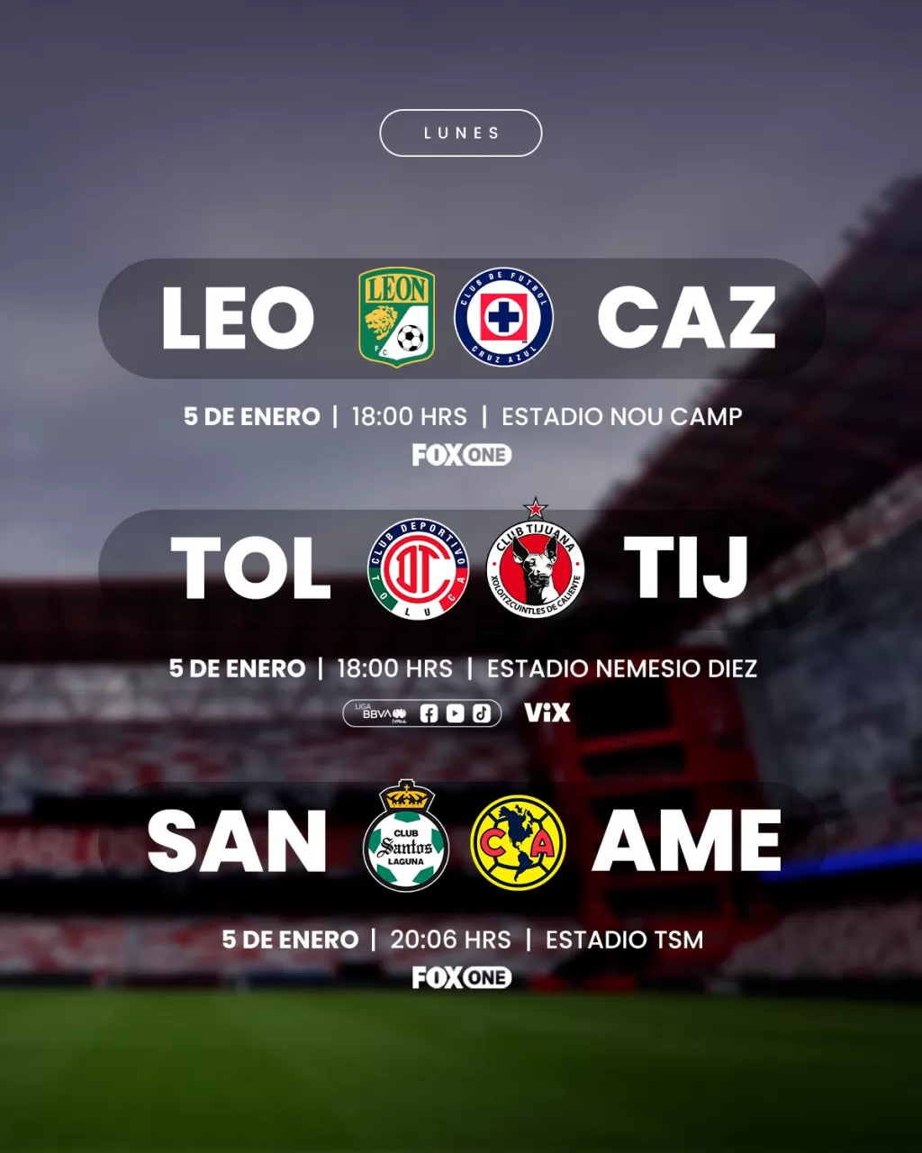 Cerrando la jornada, a las 20:06 horas (tiempo del centro de México), el Estadio TSM Corona será el escenario de un atractivo enfrentamiento entre Santos Laguna y el Club América. Las Guerreras de Santos recibirán a unas Águilas del América que buscan iniciar el Clausura 2026 con el pie derecho, tras un 2025 con resultados positivos pero sin el ansiado título. América Femenil sumó su quinto subcampeonato en el Apertura 2025 al caer ante Tigres en la final, lo que ha generado una clara exigencia de un nuevo título en Coapa. Para esta edición, las azulcremas presentarán nuevas caras como la defensora Isa Haas y Xcaret Pineda, con la expectativa de más fichajes. Históricamente, América ha mantenido una clara superioridad sobre Santos, permaneciendo invicto con un récord de 12 victorias y un empate en el historial de la Liga MX Femenil. Santos, que terminó en la decimoquinta posición el semestre pasado, buscará dar batalla y complicar el camino a sus rivales desde el inicio del torneo. La transmisión de este partido estará disponible en FOX One y Tubi.