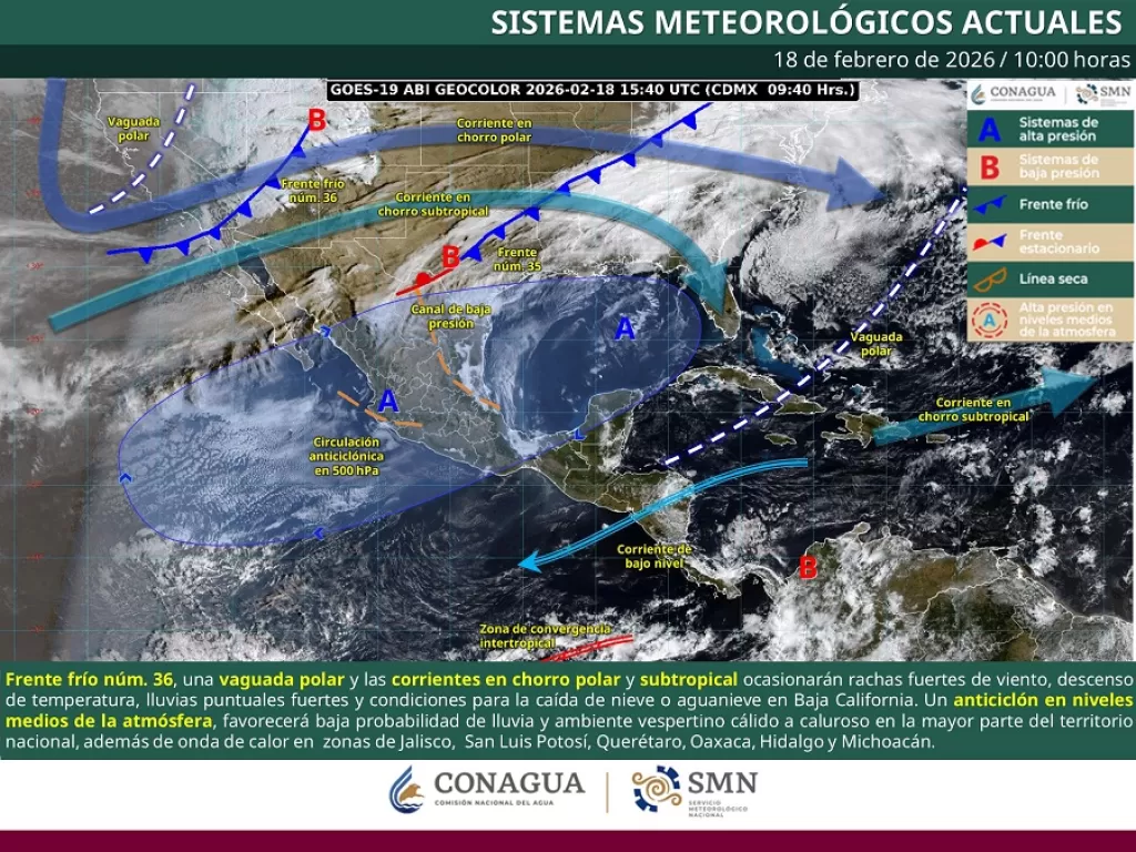 Publicado elNuevo frente frío ingresa al noroeste de México el 18 de febrero de 2026. El SMN pronostica fuertes vientos, descenso de temperatura, lluvias y posible nieve o aguanieve en sierras de Baja California, Baja California Sur y Sonora.