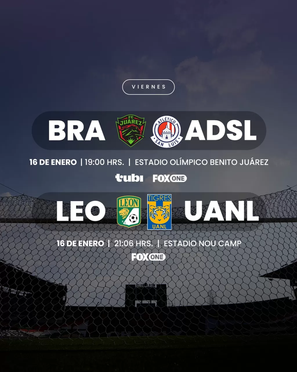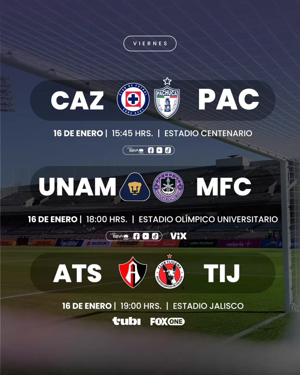 Publicado elLa Jornada 3 de Liga MX y Liga MX Femenil se vive este viernes 16 de enero de 2026. Mazatlán vs Monterrey en el Clausura 2026, y Cruz Azul vs Pachuca, Pumas vs Mazatlán, Atlas vs Tijuana, Juárez vs San Luis y León vs Tigres en el Femenil.