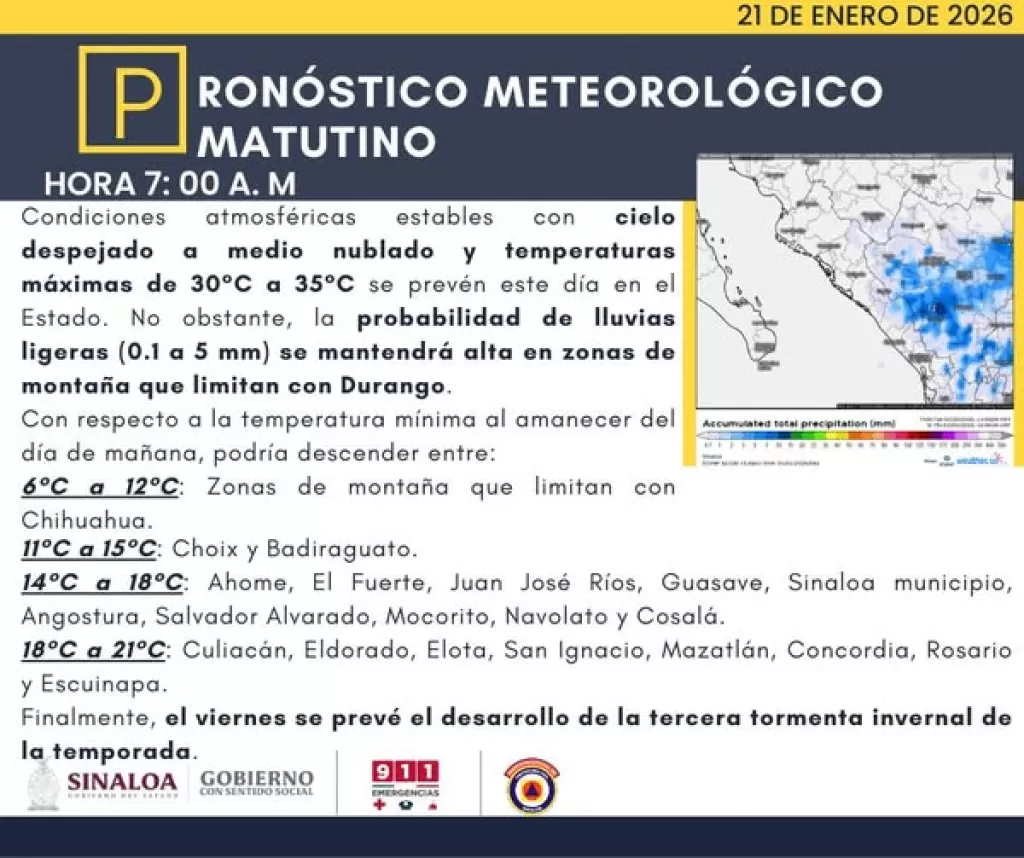 El panorama meteorológico general para Sinaloa transita de condiciones atmosféricas estables, con cielos despejados a medio nublados y temperaturas máximas de 30°C a 35°C registradas el miércoles 21 de enero. No obstante, los modelos de pronóstico alertan que la tercera tormenta invernal se desarrollará plenamente hacia el viernes 23 de enero, modificando de manera importante las condiciones climáticas. Este sistema podría incrementar la probabilidad de lluvias y un descenso más marcado del termómetro, con acumulados totales que podrían oscilar entre 60 y 100 milímetros en un lapso de seis días para Sinaloa, especialmente en el norte y las áreas serranas.