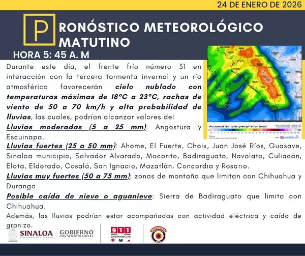 Publicado elSinaloa enfrenta el impacto de la tercera tormenta invernal este 24 de enero. Lluvias muy fuertes de hasta 75 mm, vientos de 75 km/h y posible nieve en la sierra. SMN y Protección Civil alertan sobre el día más crítico.