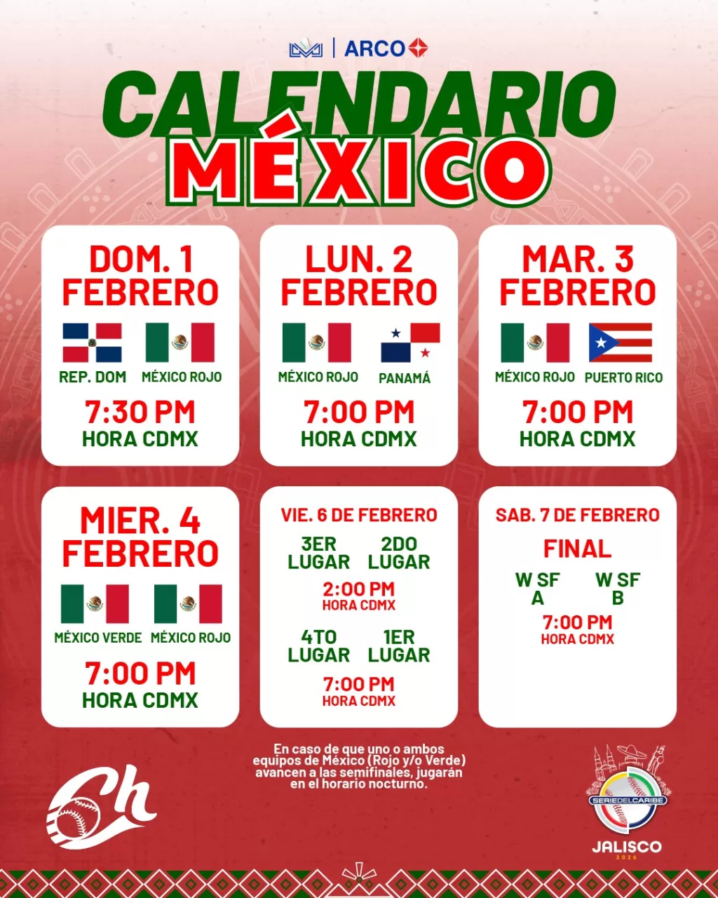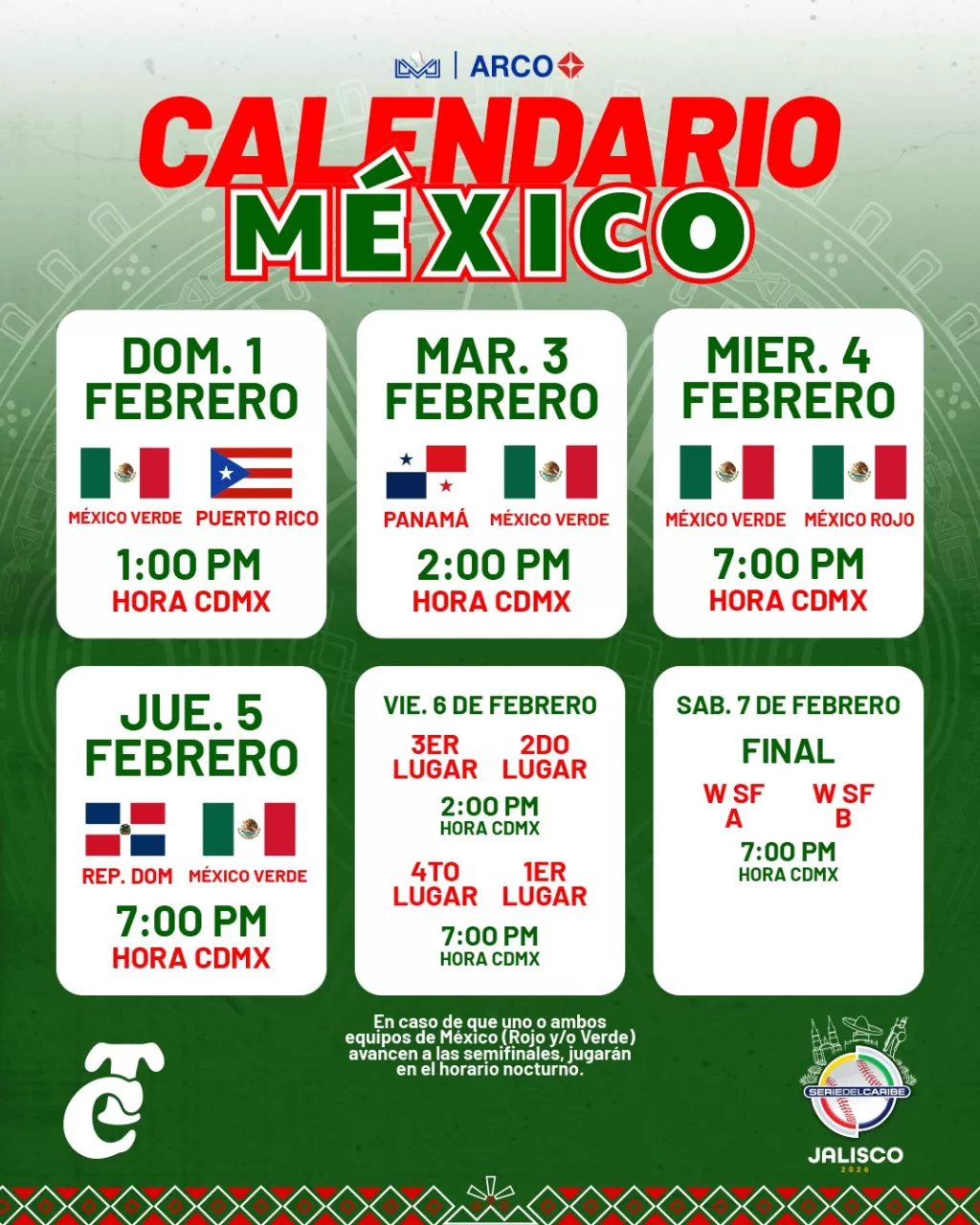 El calendario de "México Verde" en la fase inicial del torneo incluye cuatro desafiantes encuentros. El debut está programado para el 1 de febrero contra Puerto Rico, a las 12:00 horas (tiempo de Sinaloa). Posteriormente, el 3 de febrero se medirán a Panamá a las 13:00 horas. Un duelo especialmente esperado será el 4 de febrero, cuando "México Verde" se enfrente a su contraparte nacional, "México Rojo" (Charros de Jalisco), a las 18:00 horas. La primera ronda concluirá para los Tomateros el 5 de febrero, cuando se enfrenten a República Dominicana, también a las 18:00 horas. Todos estos partidos se jugarán en el horario de Sinaloa.