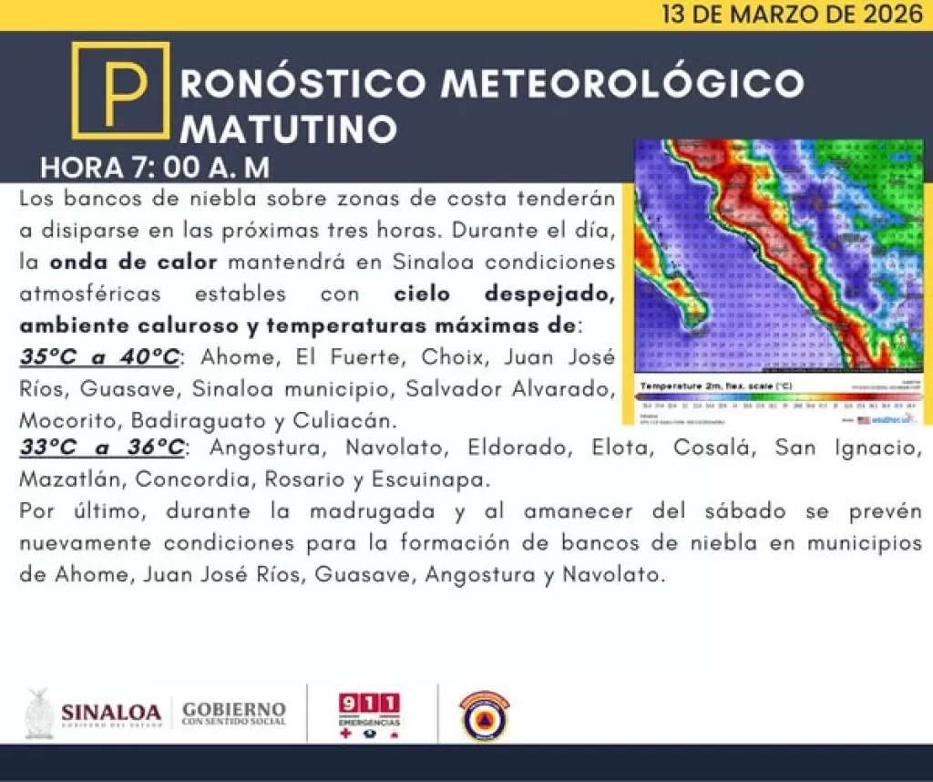 Sinaloa, Clima Sinaloa, Pronóstico 13 marzo 2026, Onda de calor Sinaloa, Temperaturas 40°C, Niebla costera Sinaloa,